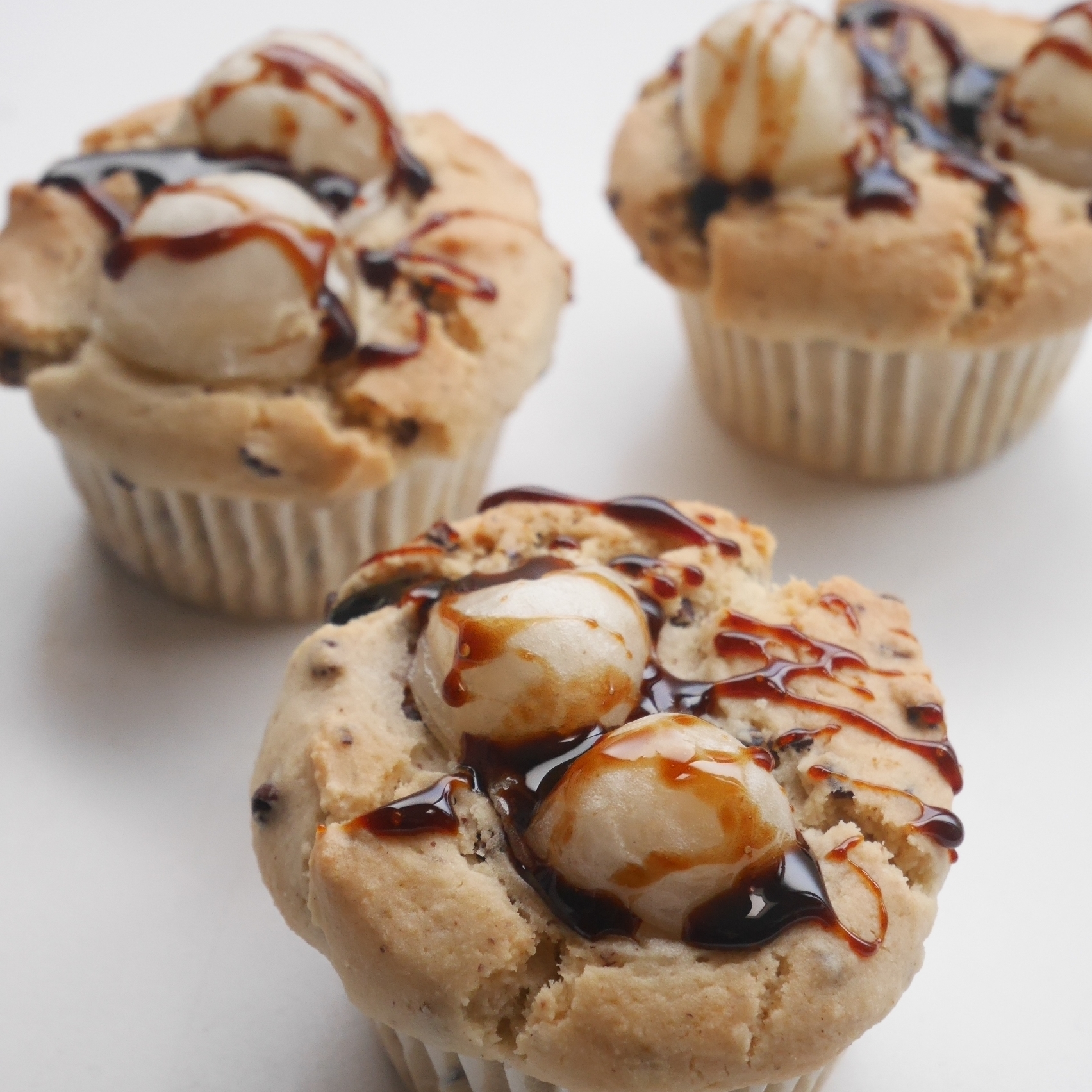 ③砂糖不使用のデーツキャラメル風クリーム入りマフィン~(プレーン生地×白玉トッピング黒糖ソースかけ)